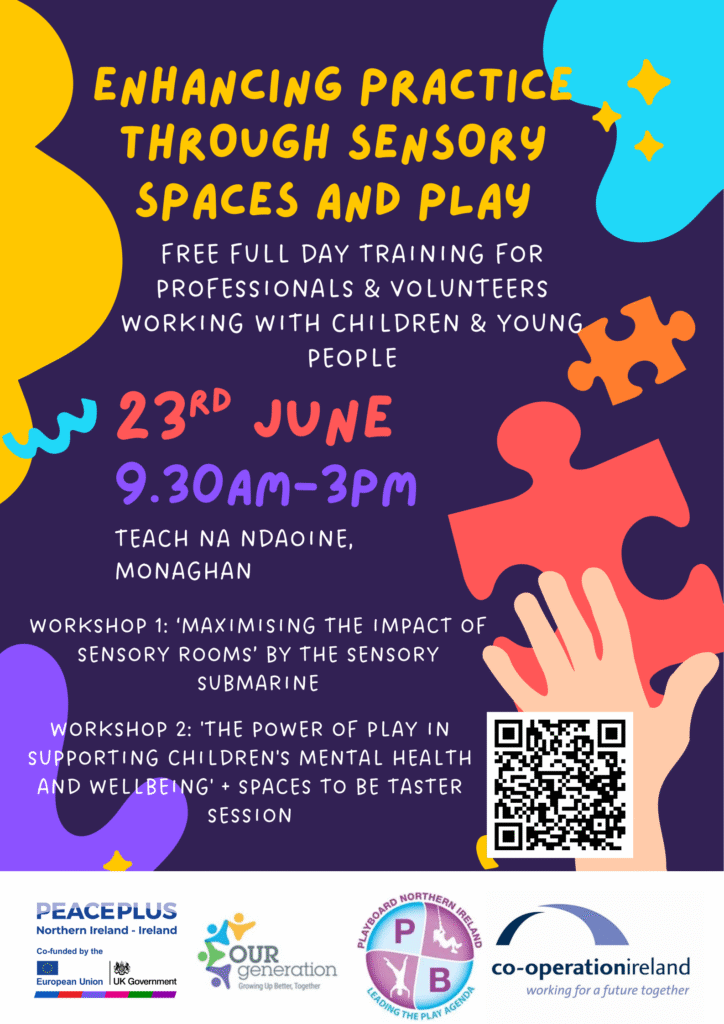 In partnership with Co-operation Ireland, we’re hosting a FREE full day training for professionals and volunteers working with children and young people. The session will look at practical strategies to support diverse needs and nurture well-being through sensory and playful approaches.