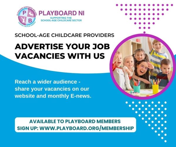 If you would like to advertise your play/school-age childcare vacancies with us, download and complete the job vacancy form and return to info@playboard.org